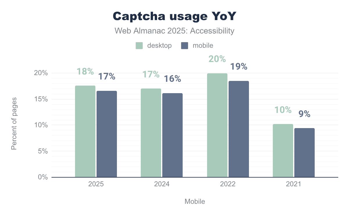 The number of sites that disable zooming or scaling continues to drop. In 2025, only 19% of mobile sites and 21% of desktop sites restrict scaling, either by using user-scalable=no or setting a restrictive maximum scale. That’s a 1–2% improvement over 2024, showing slow but steady progress.