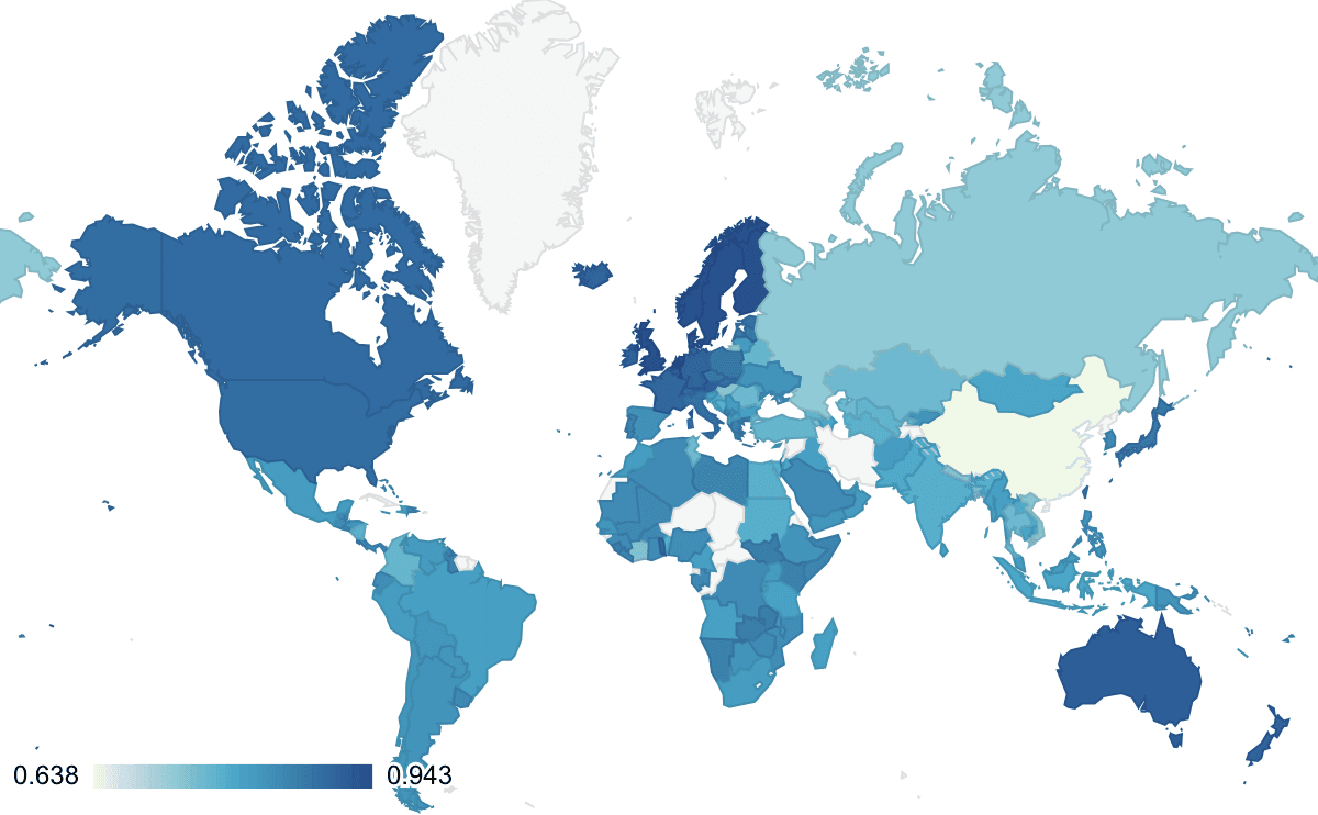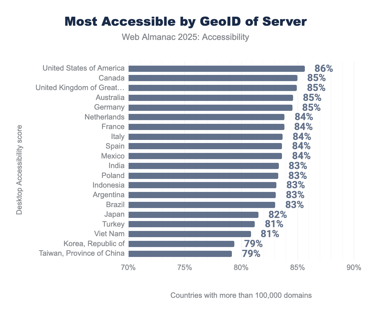 In 2025, the United States remains the most accessible country by GeoID, a position driven by decades of Section 508 compliance requirements for federal agencies and ongoing ADA Title III litigation. The .edu and .gov TLDs also lead accessibility metrics, reflecting mandatory compliance for U.S. government and educational institutions.