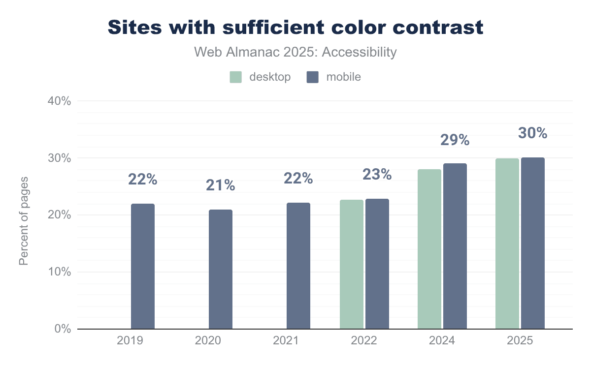 This year, text contrast pass rate improved by roughly 1% compared to 2024. But only 31% of mobile sites currently meet minimum color contrast requirements. Since mobile experiences depend heavily on clear visibility, this gap is a real problem for users accessing the web on their phones.