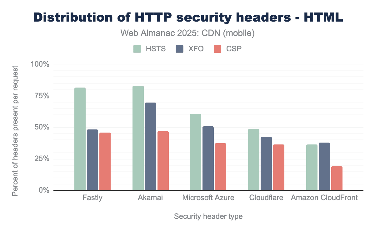 Fastly and Akamai have more secure defaults for security headers when basic features are enabled which drives higher rates of security headers. Amazon CloudFront and Cloudflare require more non-default configurations to inject and enforce security headers leading to a lower adoption.