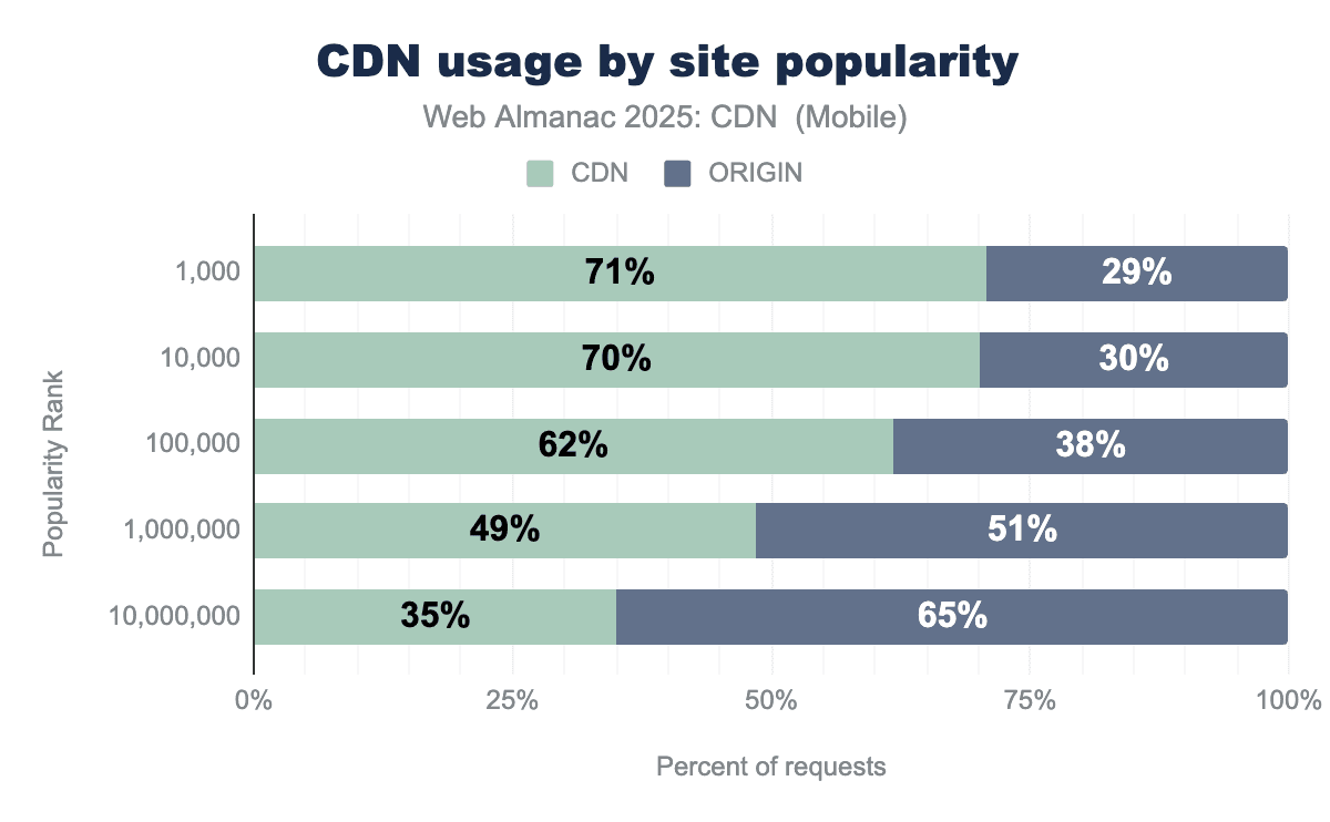 - Protocol Leadership: CDNs show 29-45% HTTP/3 adoption versus <7% for origins