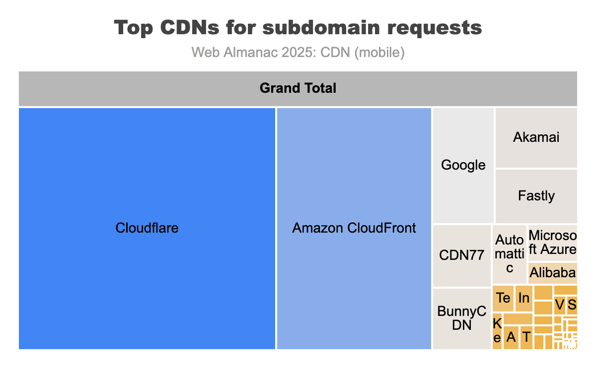 Google leads the list third-party domain usage at 53% market share, followed by well-known CDN providers such as Cloudflare (17%), Amazon CloudFront (11%), Fastly (5%), and Akamai and Facebook (4%).