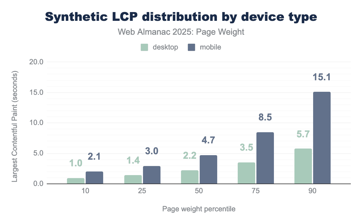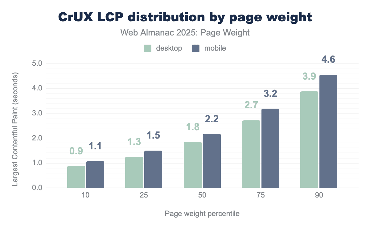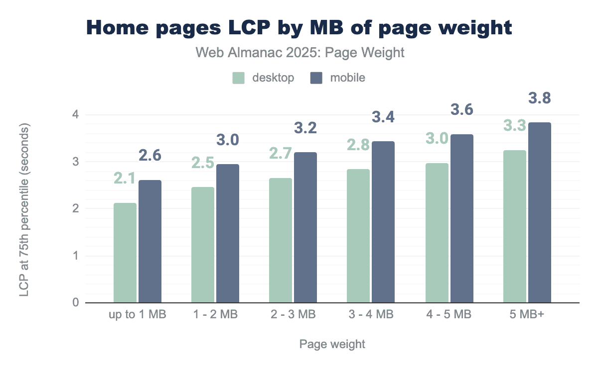 For home pages in the 2-3 MB range, LCP was achieved in 2.7 seconds on desktop and 3.2 seconds on mobile. Mobile struggled to achieve sub-2.5-second times, even for pages under 1 MB, which recorded 2.6 seconds for LCP. As page weight increases, LCP times rise accordingly, with mobile taking roughly half a second longer to render the largest content element.