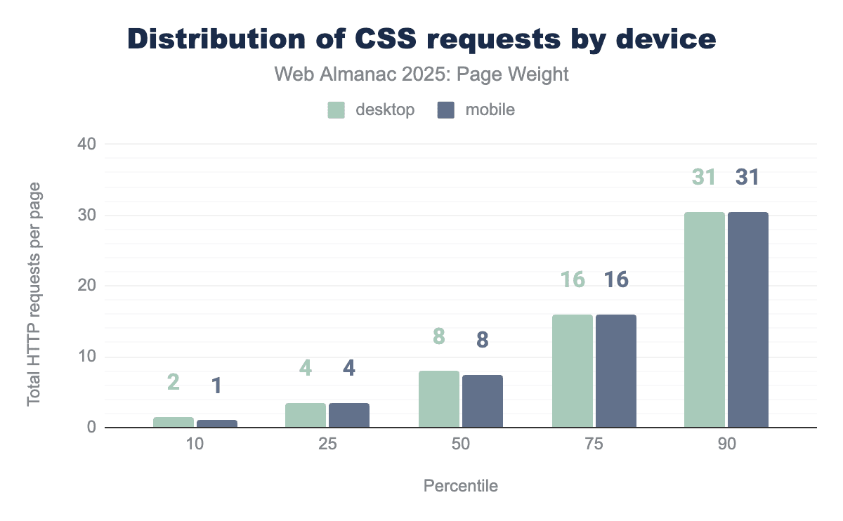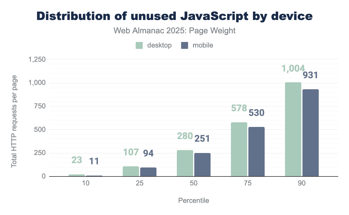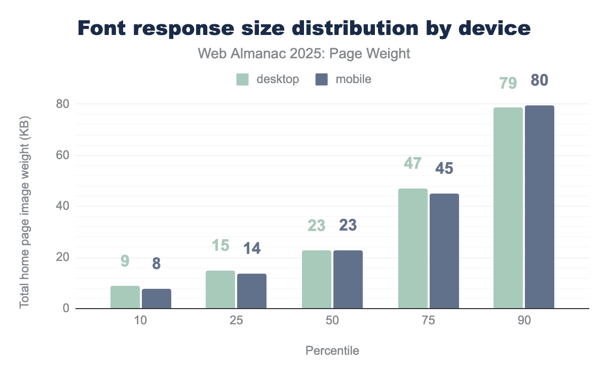 Year over year, the median home page size grew 7.8% to 2.7 MB. The median mobile home page is 2.6 MB, growing 8.4% from 2.4 MB in 2024. In 2025, the median desktop page size reached 2.9 MB, up 7.3% from 2024’s median of 2.7 MB.