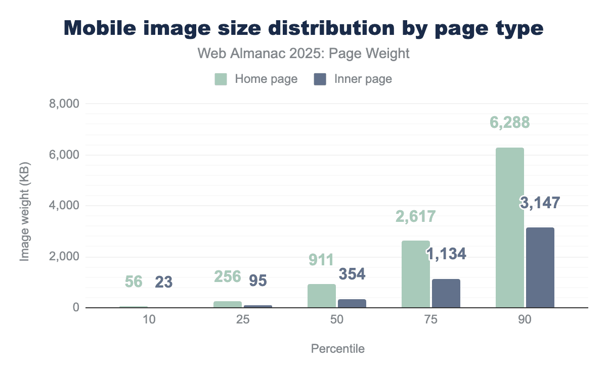 A web page rarely uses a single image. When aggregated together, the median desktop page used 1,059 KB of images. Mobile pages used 911 KB. Desktop pages consistently loaded more total image bytes.