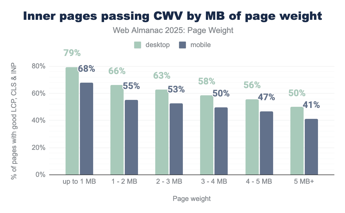 The data shows a softened pattern for inner pages than home pages. 79% of desktop inner pages weighing under 1 MB passed the Core Web Vitals assessment. 50% of inner pages 5 MB or larger passed the assessment. Mobile pages are less likely to pass, and passing rates decline gradually with each additional megabyte.