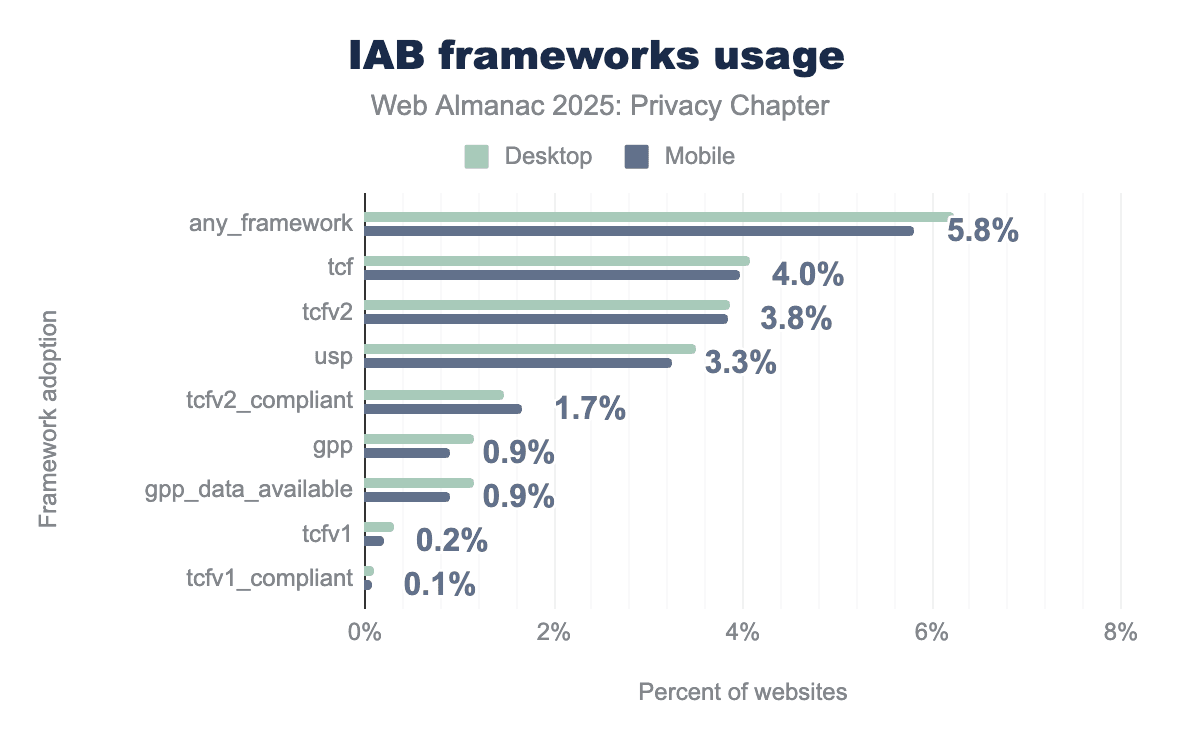 Overall IAB framework adoption remains steady at just above 5.5% for both mobile and desktop. TCF continues to be the most widely adopted framework at 4.0% with TCFv2 accounting for 3.8%. However, only 1.7% of sites are fully TCFv2 compliant, less than half of those claiming to use TCFv2, suggesting that many implementations remain incomplete or improperly configured. USP holds steady at 3.3%, reflecting continued CCPA compliance efforts.