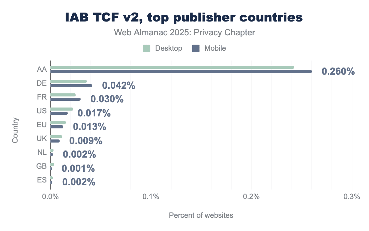 Germany (0.042%) and France (0.030%) lead TCFv2 publisher adoption among EU member states, with the US appearing at 0.017%, notable given TCF isn’t required outside the EU. The largest share (0.26%) falls under ’AA’, an undefined country code, pointing to gaps in publisher metadata or misconfigured CMP implementations. Overall adoption remains low even among European publishers, suggesting TCFv2 is concentrated among a small subset of sites despite GDPR requirements.