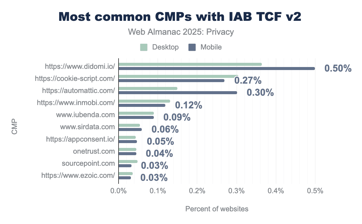 The CMP landscape shifted notably this year. Automattic, which led in 2024 at 0.67%, dropped to 0.30% in 2025, while Didomi climbed from 0.22% to 0.50%, taking the top spot. Cookie-script emerged as a new entrant at 0.27%, ranking second on desktop. The remaining providers, InMobi, Iubenda, Sirdata, AppConsent, OneTrust, Sourcepoint, and Ezoic, each account for less than 0.12% of sites, showing that TCFv2 CMP adoption remains concentrated among a few major players.