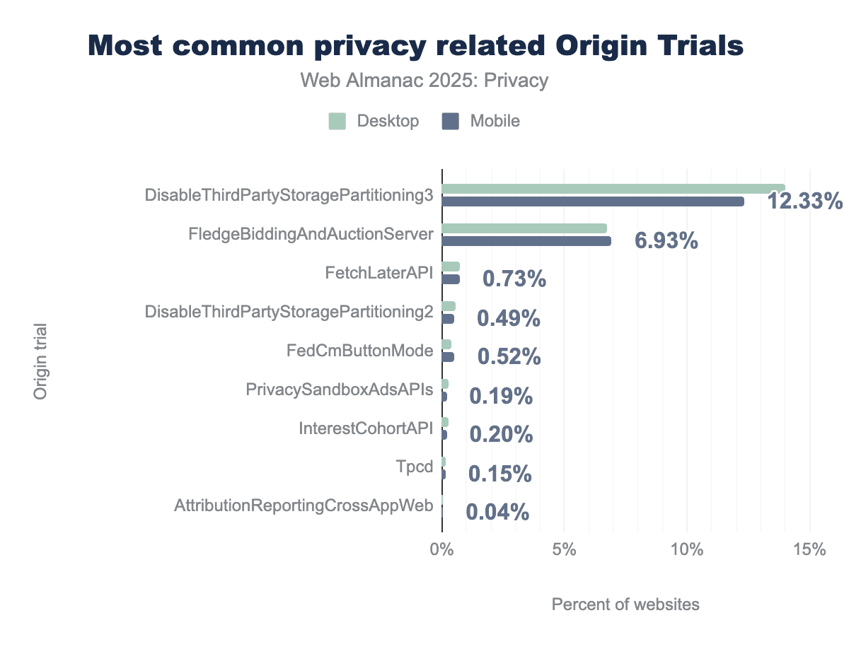 Origin trials let browsers test experimental features on real websites before committing to a full rollout. Sites can opt in to access new capabilities early, or opt into deprecation trials to temporarily delay changes that would break existing functionality. These trials help browser vendors gather data on how features perform in production while giving developers time to adapt, and as we’ll see, most privacy-related adoption falls into the deprecation category.