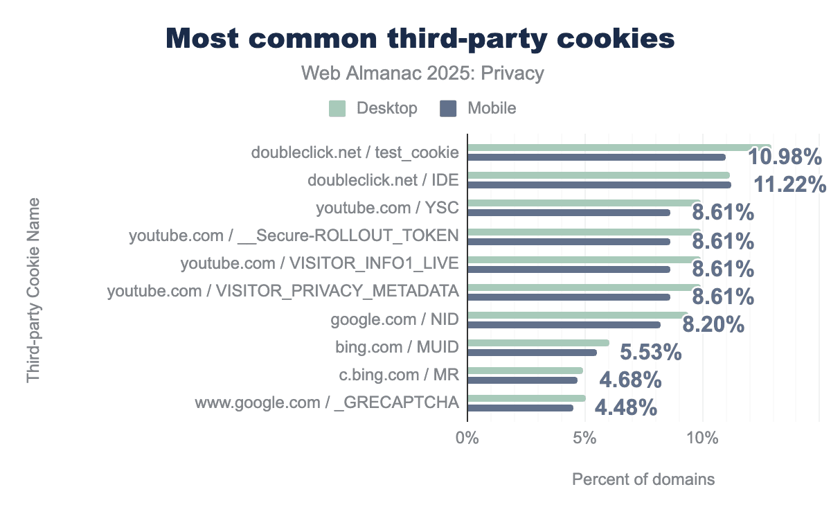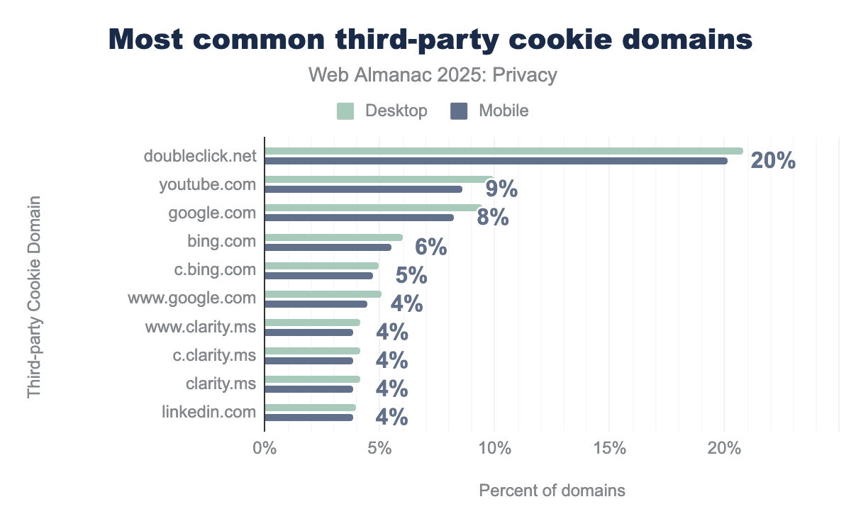 Our analysis shows that doubleclick.net is the most common third-party cookie domain, appearing on 20% of desktop sites, followed by youtube.com (9%) and google.com (8%). Overall, while Google entities dominate the top rankings, Microsoft’s bing.com and clarity.ms, along with linkedin.com, represent the most significant alternative third-party cookie setters.
