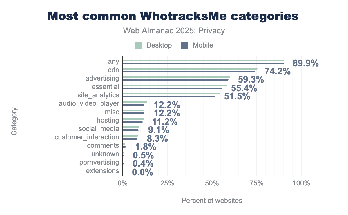 Furthermore, when categorizing these services by function, Analytics dominates the landscape, appearing on 64% of desktop webpages. Advertising and Cookie compliance tools follow at 15% and 14% respectively, illustrating that performance monitoring remains the primary driver of data collection. More specialized tracking methods, such as Segmentation and Retargeting, are significantly less common, each found on fewer than 3% of sites.