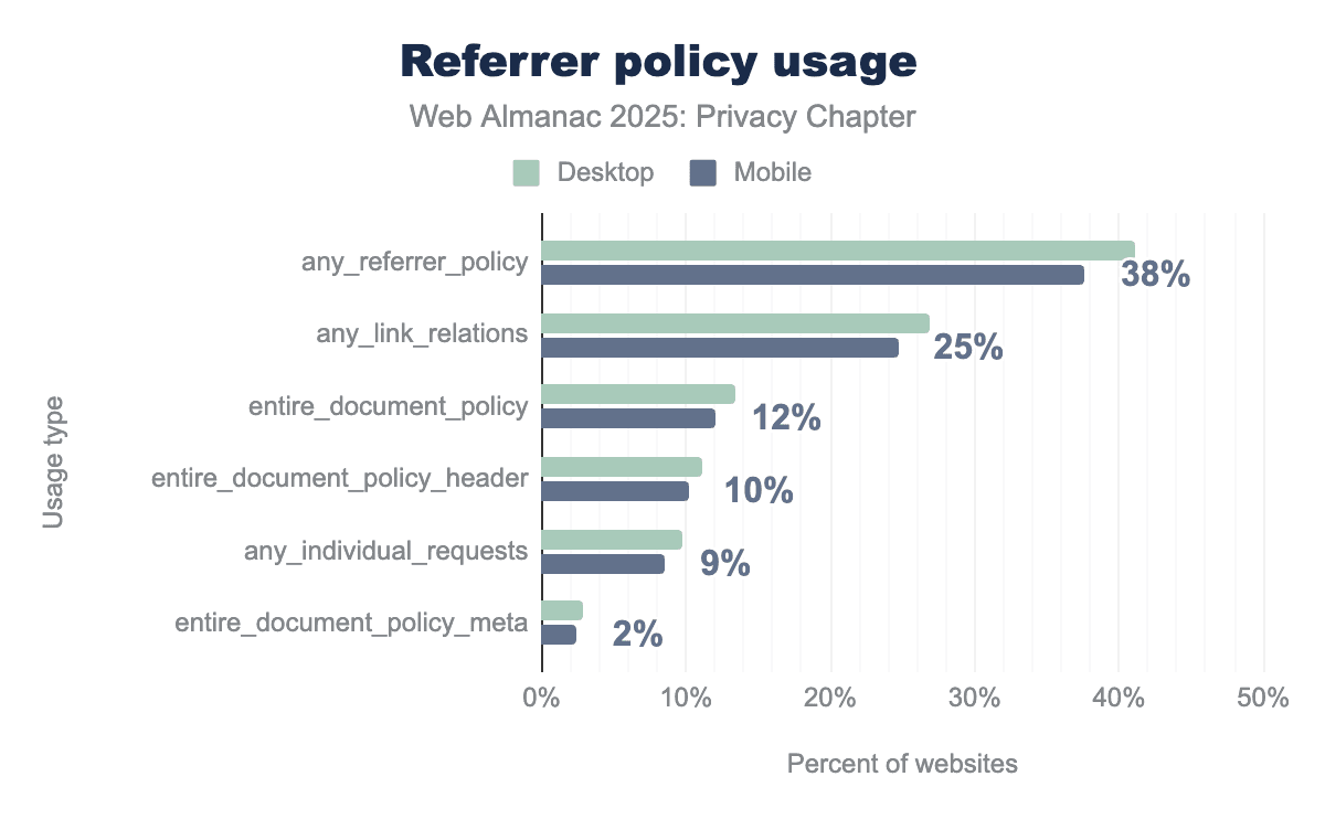 Overall adoption of Referrer Policy rose from 32% in 2024 to 37.66% in 2025, a healthy increase. The most common implementation method remains link-level controls (like rel="noreferrer" on individual links) at 24.70%, while document-wide policies set via headers sit at 10.16%. This suggests many sites apply referrer restrictions selectively rather than as a blanket rule.