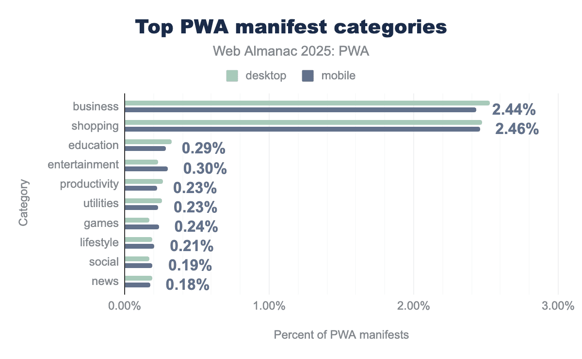While the manifest key categories is not used in many PWAs, these results hint at the top verticals on which web apps are more popular.