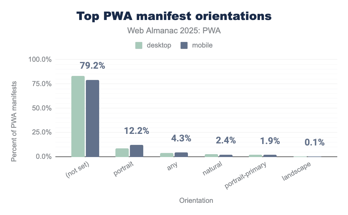 portrait is the most common selection at approximately 12 percent, with mobile applications showing a significantly higher tendency to lock this orientation compared to desktop versions. Other specific orientation values such as any, natural, and portrait-primary see very low adoption, each appearing in fewer than 5 percent of manifests, while landscape is the least utilized at just 0.1 percent.Unsurprisingly, around 79.2% of PWAs do not set orientation. Responsive design and modern development make defining the app’s orientation less necessary, but portrait takes second place with around 12.2%.