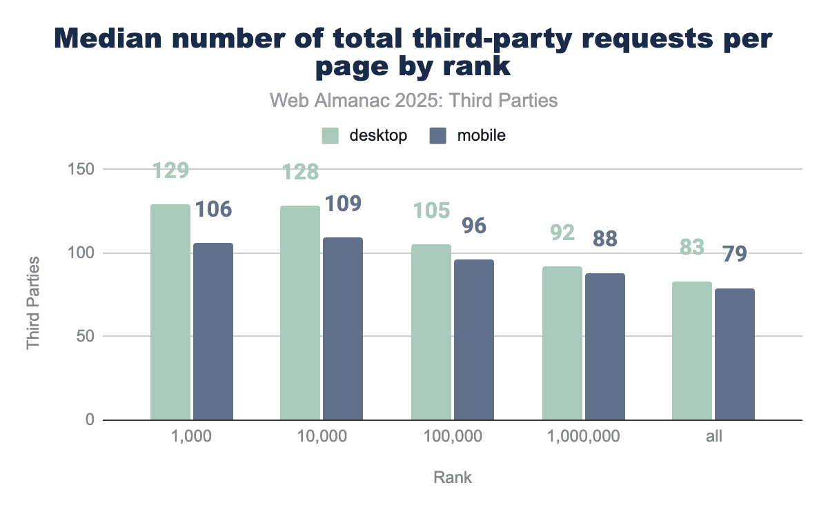 Low-ranked websites load more third-party requests. The top 1,000 have a median of 129 requests on desktop and 106 on mobile, compared to 83 on desktop and 79 on mobile across all sites.